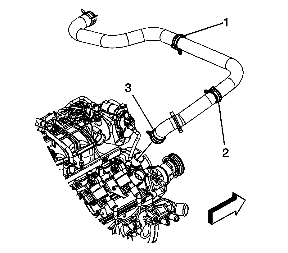 5. Reposition the radiator inlet hose clamp (3) at the water pump.