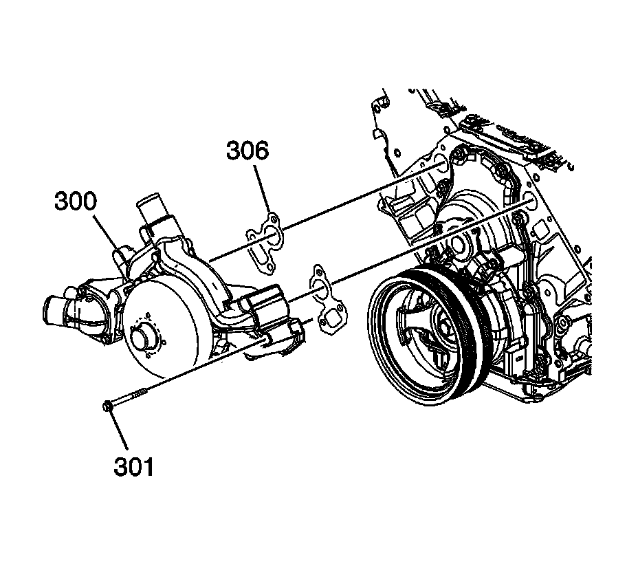3. Position the water pump (300) and NEW gaskets (306) to the engine block.