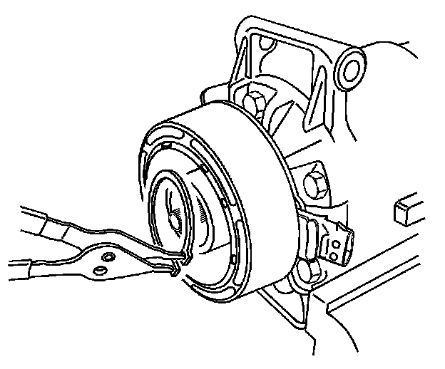 4. Remove the compressor pulley snap ring using the J 6083 .