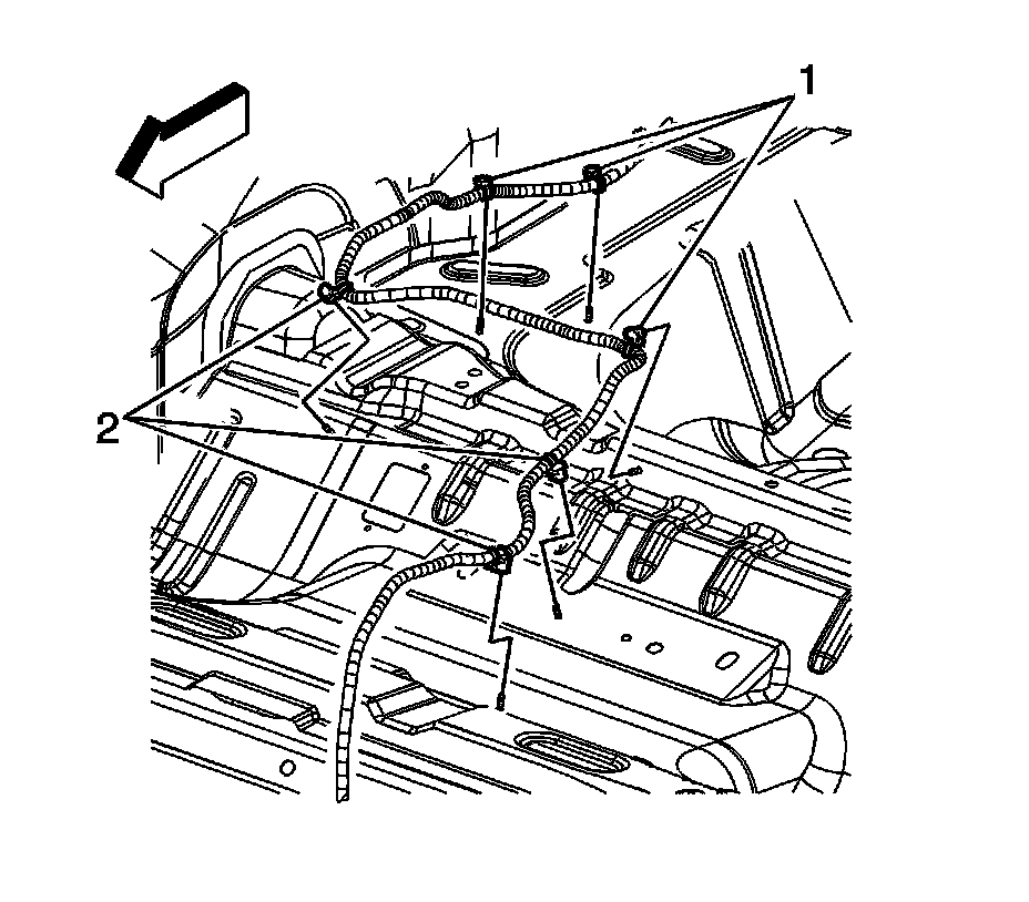 16. Install the positive battery cable clips (1, 2) to the rear compartment panel studs.