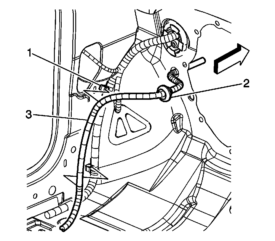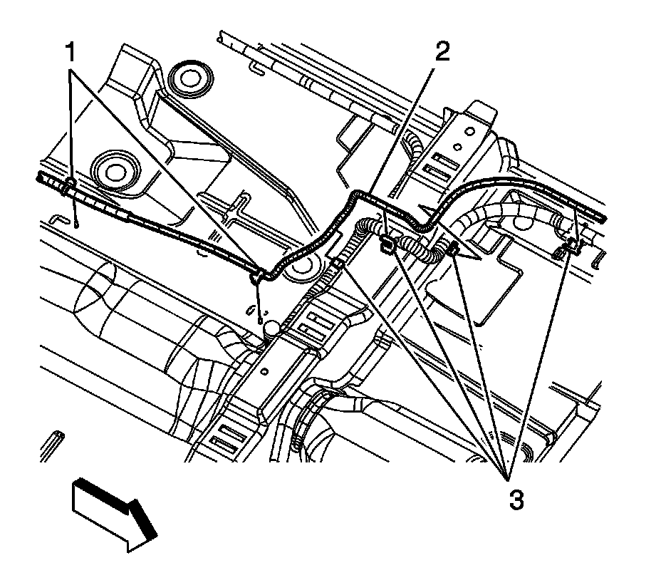10. Install the positive battery cable (3) to the clips (1) on the body harness.