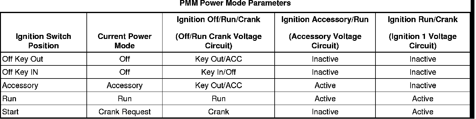With a scan tool, compare all parameters listed below with the corresponding ignition key position. The PMM Power Mode Parameters table below illustrates the correct state of these input parameters (circuits) in correspondence to the ignition switch position. The circuits which the individual parameters are related to are in parentheses.