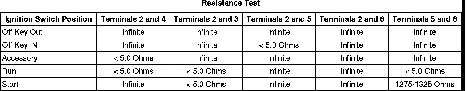 2. Using the Resistance Test table below, check the resistance between the terminals of the ignition switch listed in each switch position.