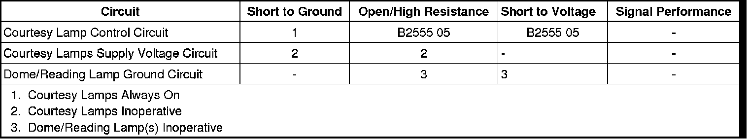 * DTC B2555 05 will set when the BCM detects a short to voltage in the courtesy lamp control circuit.