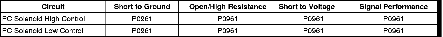 The PC solenoid duty cycle is outside the range of 0.5-95 percent for 2 seconds.