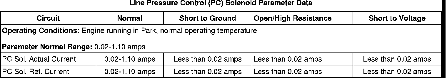 Start and idle the engine. Using the scan tool, select PC Solenoid under the Transmission Output Controls. With the scan tool, command several values of solenoid reference current from 0.1 amp through 1.1 amps and observe the PC Sol. Actual Current and the PC Sol. Ref. Current. The PC Sol. Actual Current should not vary from the PC Sol. Ref. Current by more than 0.16 amps.