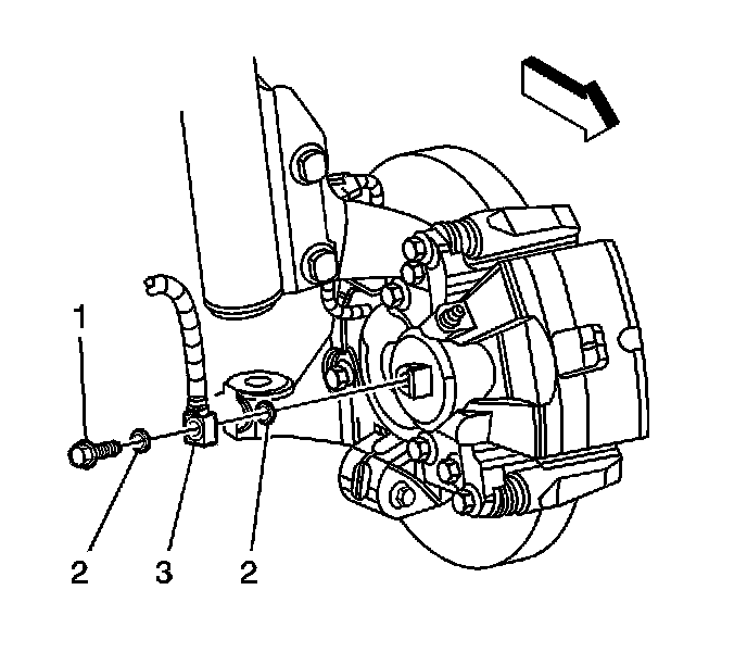 11. Remove the brake hose fitting gaskets (2) and the brake hose (3) from the brake caliper.