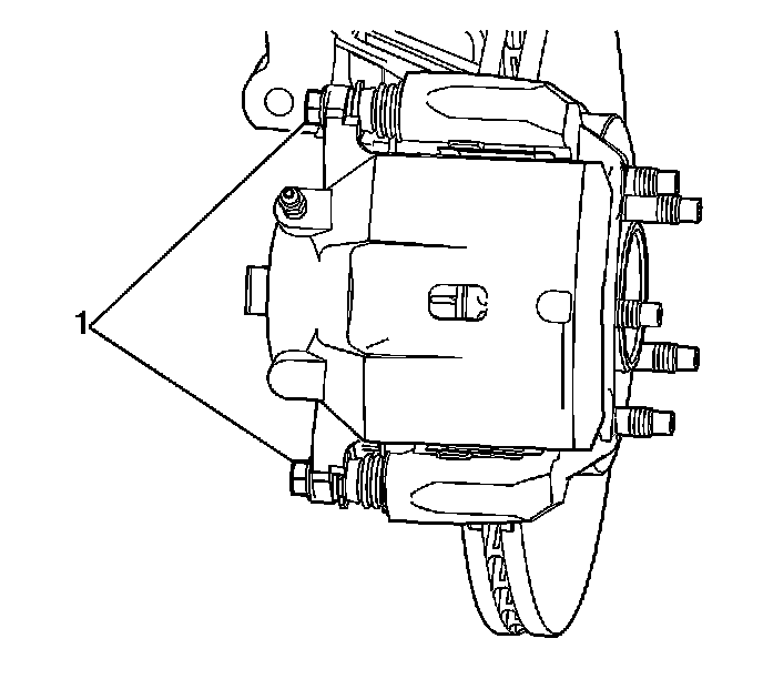 13. Remove the brake caliper guide pin bolts (1).