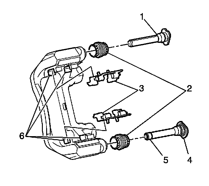 10. Inspect the brake caliper guide pins (1, 4) for freedom of movement, and inspect the condition of the guide pin boots (2). Move the guide pins inboard and outboard within the bracket bores, without disengaging the slides from the boots, and observe for the following: