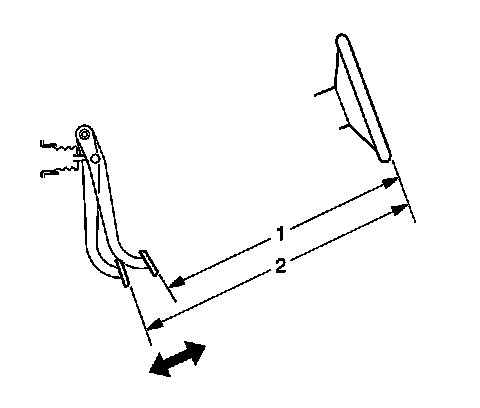 8. Subtract the initial measurement, unapplied (1), from the averaged, applied measurement (2) to obtain the brake pedal travel distance.
