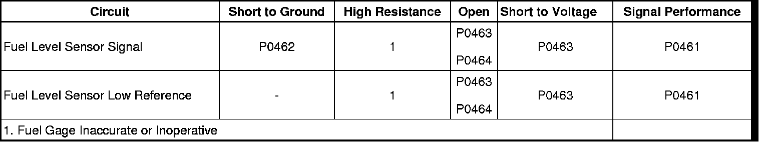 The fuel level sensor changes resistance in response to the fuel level. The engine control module (ECM) monitors the signal circuit of the fuel level sensor in order to determine the fuel level. When the fuel tank is full, the fuel level sensor resistance is low and the ECM senses a low signal voltage. When the fuel tank is empty, the fuel level sensor resistance is high and the ECM senses a high signal voltage. The ECM uses the signal circuit of the fuel level sensor in order to calculate the percentage of fuel remaining in the tank. The ECM sends the fuel level information via the serial data circuit to the body control module (BCM). The BCM sends the fuel information to the instrument panel cluster via the serial data circuit in order to control the fuel gage and display the fuel level.