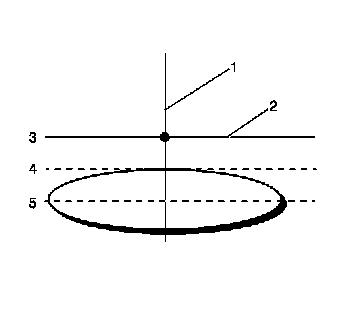 4. Adjust the fog lamps up or down until the top edge of the high intensity zone on the screen is 102 mm (4 in) below the horizontal centerline (2), within the range of 0 mm (0 in) (3) to 203 mm (8 in) (5), below the horizontal centerline, on the target screen.