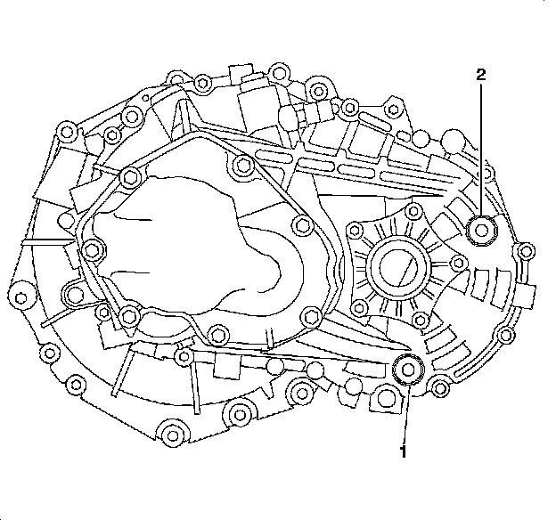 5. Using a funnel with a flexible spout or a quart bottle hand pump, add manual transaxle lubricant through the level plug (2) opening until fluid flows out.