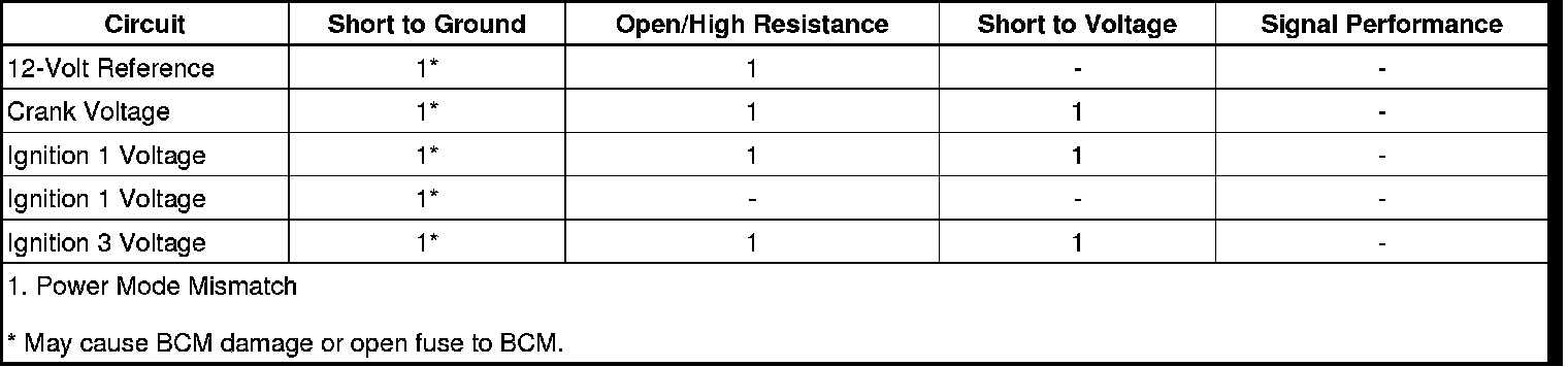 * Ignition 1 voltage, BCM terminal 22 and ignition switch terminal 7