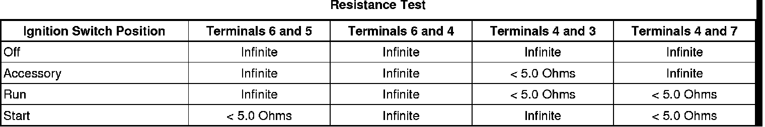 Using the Resistance Test below, check the resistance between the terminals of the ignition switch listed in each switch position listed.