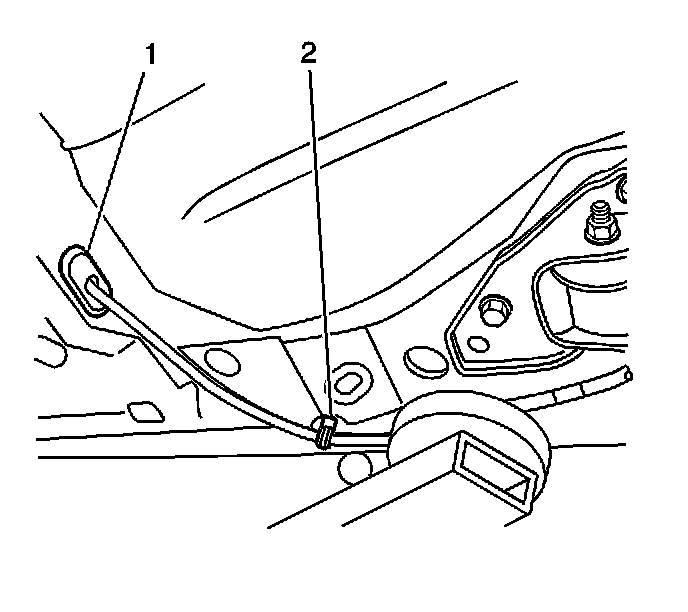 5. Remove the rear park brake cables from the retaining clips (2) at the rear axle mounting bracket.