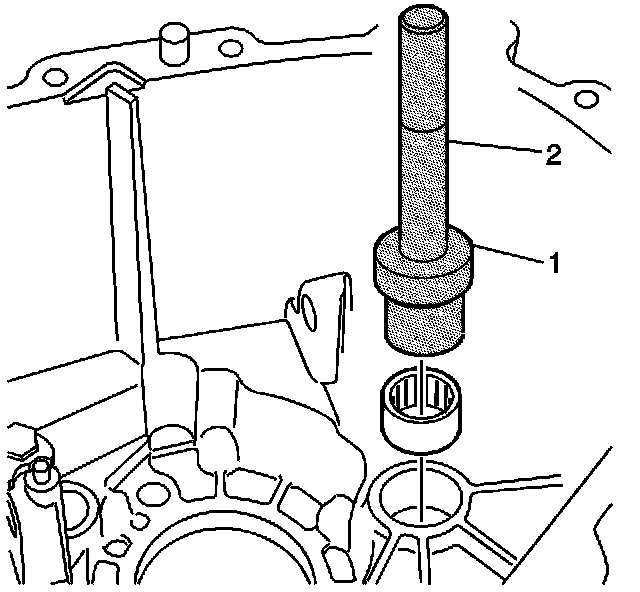 2. Install the intermediate shaft needle bearing to the transmission housing using the J 44383 (1) and the J 7079-2 (2).