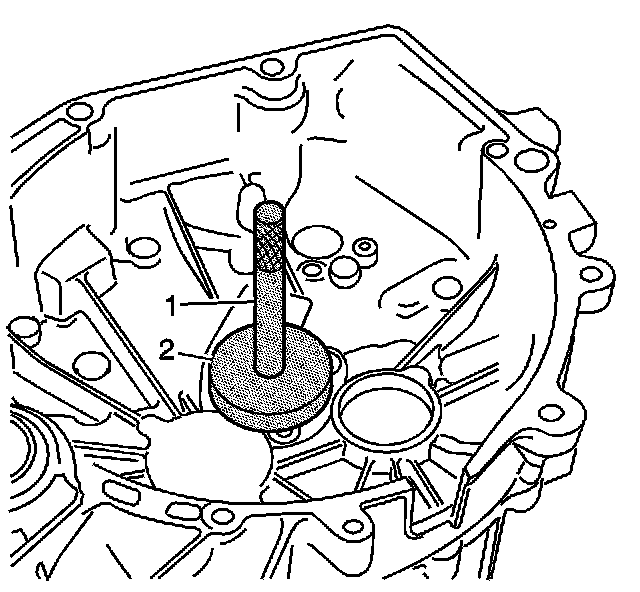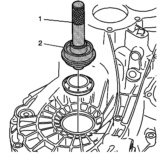 6. Install a new differential bearing race to the transmission housing using the J 44385 (2) and the J 7079-2 (1).