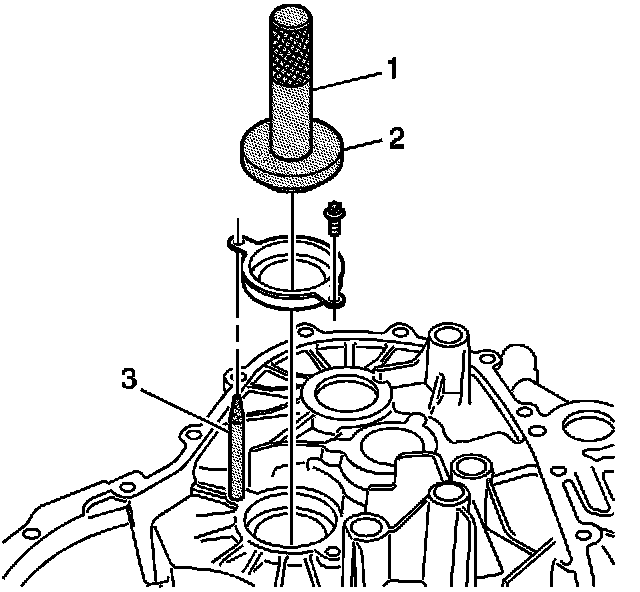 11. Install the output shaft bearing race and bolts using the J 44387-1 (2), J 44387-2 (3), and the J 8092 (1).