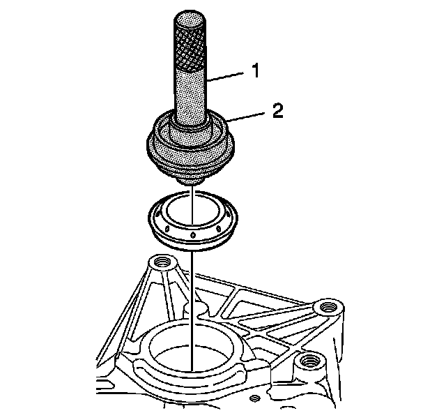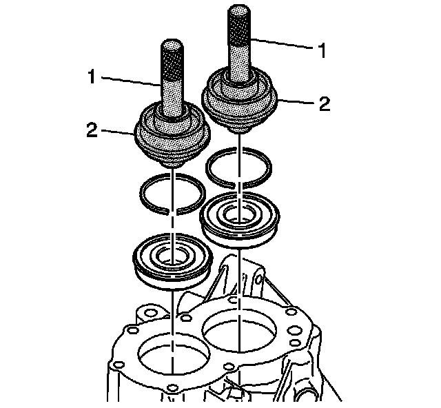 7. Install a new differential side bearing race seal to the transmission housing using the J 44385 (2) and the J 7079-2 (1).
