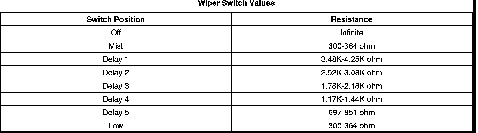 2. Test the resistance between terminals D and E. Rotate the wiper switch and compare the resistance readings to the values in the Windshield Wiper Switch Values table below for MIST, each DELAY and LOW speed.