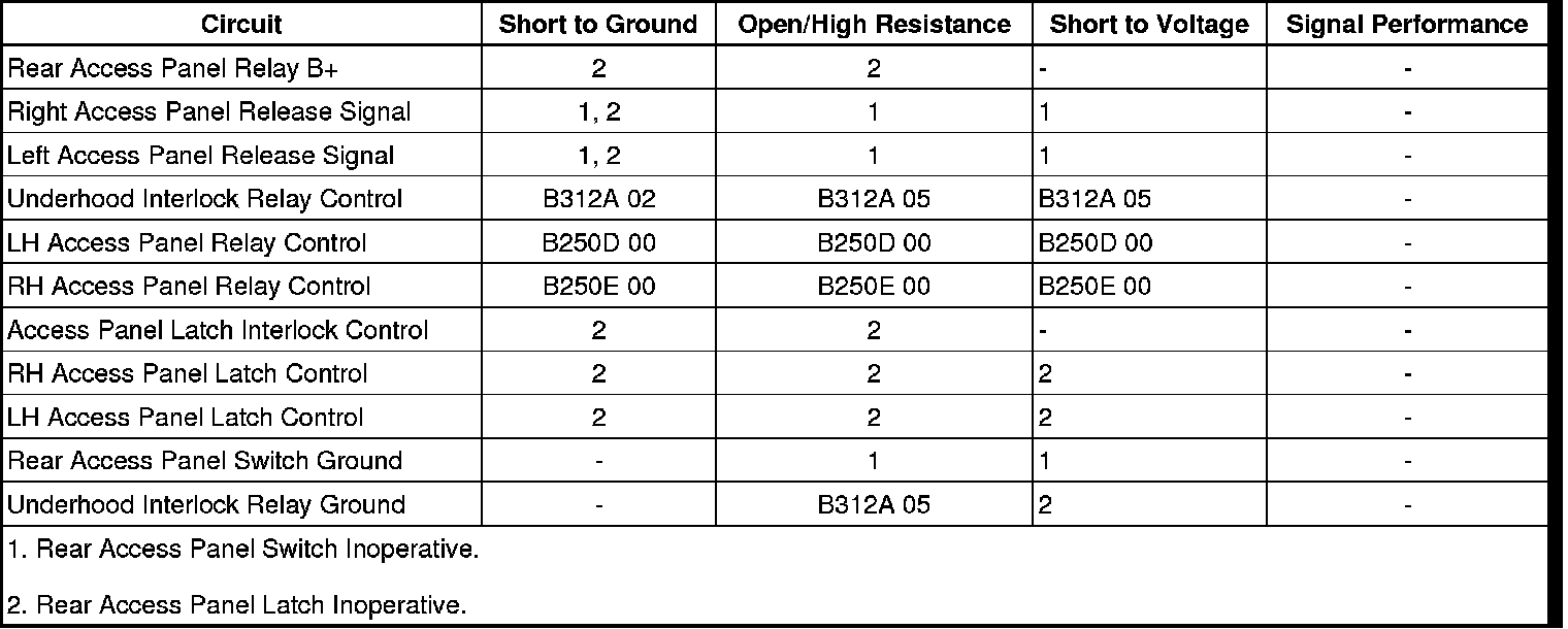 The instrument panel cluster (IPC) monitors the circuit and if it detects a request for the rear access panels to activate, it will send B+ voltage to the interlock relay provided the vehicle speed is less than 3 km/h (1 mph). This will energize the relay and provide ground for the access panel actuators.