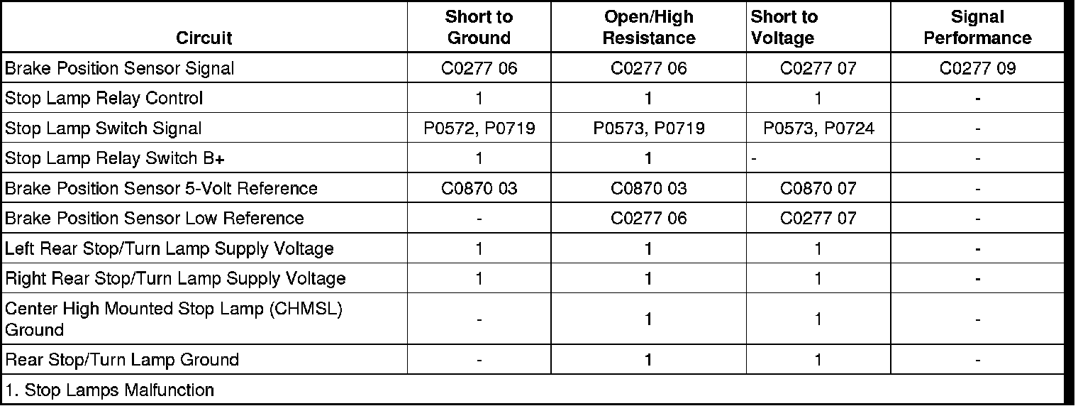 The brake pedal position sensor is used to sense the action of the driver application of the brake pedal. The brake pedal position sensor provides an analog voltage signal that will increase as the brake pedal is applied. The body control module (BCM) provides a low reference signal and a 5-volt reference voltage to the brake pedal position sensor. When the variable signal reaches a voltage threshold indicating the brakes have been applied, the BCM will apply battery positive voltage to the stop lamps, transmission control module (TCM), engine control module (ECM), and stop lamp relay coil side. The BCM also supplies the stop lamp relay coil with ground. When the stop lamp relay receives battery voltage and ground from the BCM, the relay coil is energized and the stop lamp relay switch contacts close applying battery voltage through the STOP/B/U/LPS fuse to illuminate the center high mounted stop lamp (CHMSL).