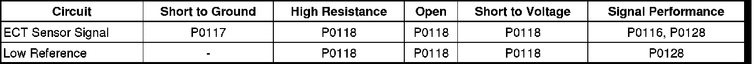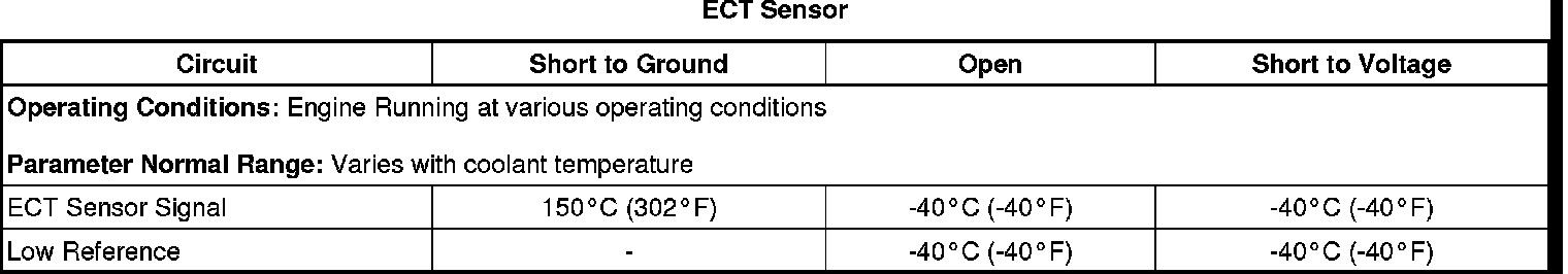 * A slight to moderate resistance in the ECT sensor signal circuit or low reference circuit will affect this diagnostic. This condition results in a greater voltage on the ECT sensor signal circuit, which is interpreted by the ECM as a colder ECT.