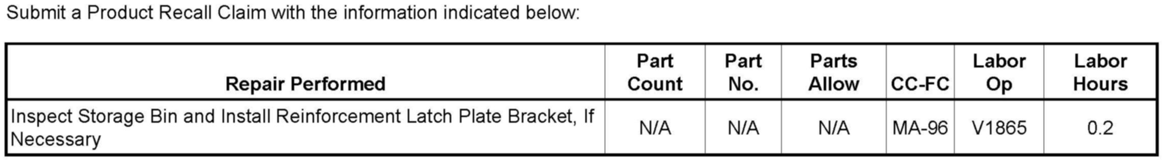 Inspect the storage bin, and if necessary, install a reinforcement latch plate bracket. Because the reinforcement latch plate bracket is easy to install, and to reduce customer inconvenience, the bracket and inspection/installation instructions will be mailed to customers of record. Customers who require the bracket but do not wish to install it are being provided the option of taking the bracket to their dealer for installation. Dealers are to inspect all involved vehicles currently in inventory and install the bracket, if necessary.