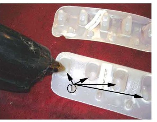 5. Apply hot glue to the energy absorbing (EA) plastic piece pocket areas (1).