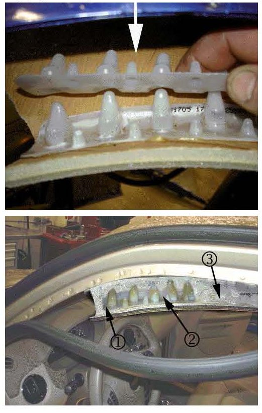 Ensure that the energy absorbing (EA) plastic piece (2) is installed onto the front edge (1) of the existing headliner plastic piece. The body of the EA plastic piece should be firmly attached to the headliner (3).