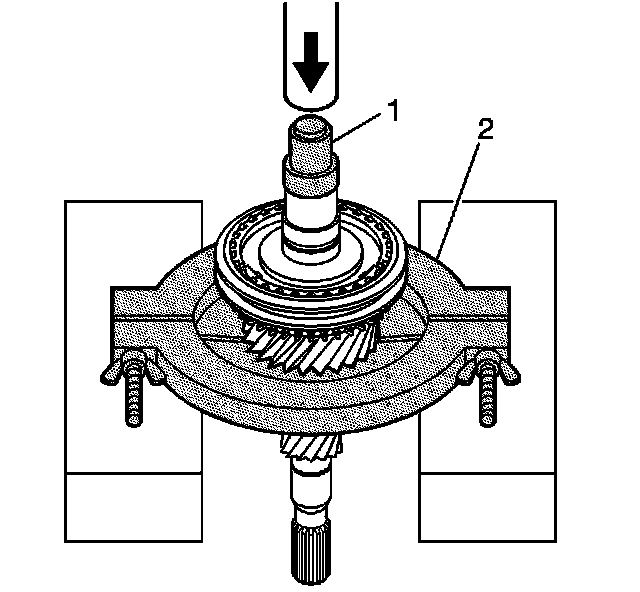 7. Remove the gear shaft components from the input shaft using the J 36513 (2) under the 3rd speed gear, the J 44378 (1), and a hydraulic press.