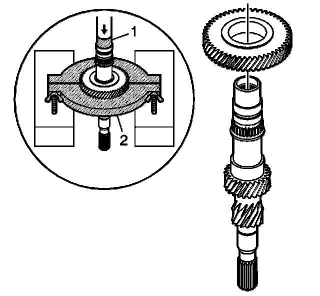 12. Press off 5th gear using the J 44378 (1), the J 36513 (2) and a hydraulic press.