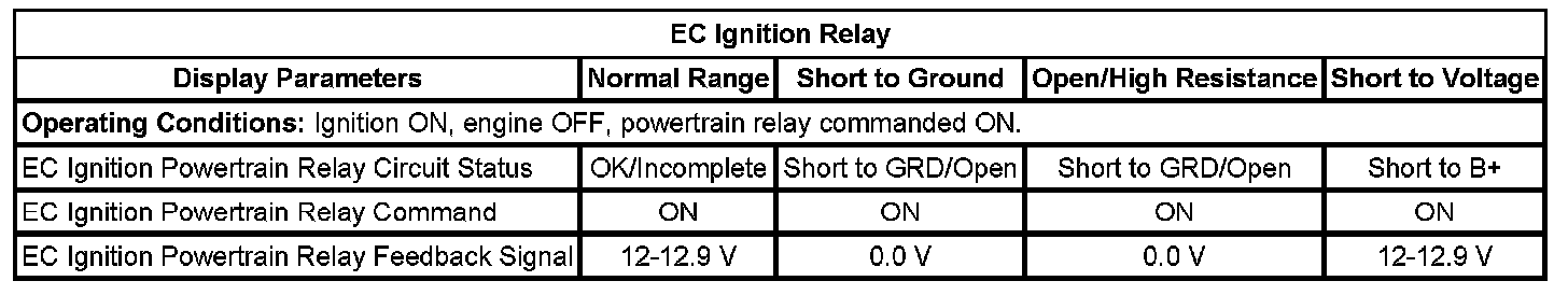 12. Ignition ON, engine OFF, monitor the EC Ignition Relay Feedback parameter with a scan tool. The parameter should display B+.