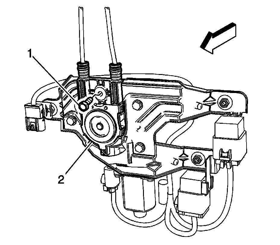 10. Remove the regulator (1) and cables (2) from the vehicle.