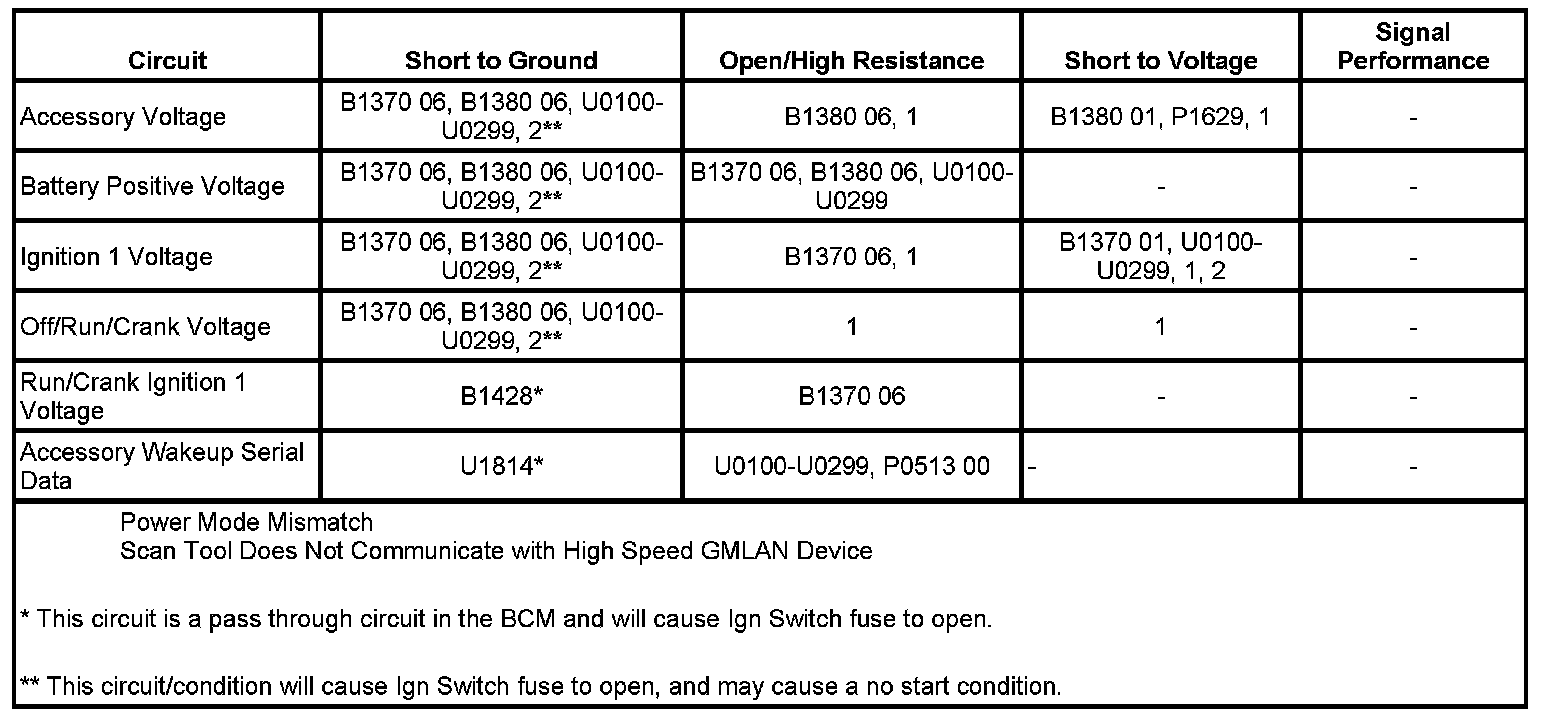 This vehicles power mode master (PMM) is the body control module (BCM). The ignition switch is a low current switch with multiple discrete ignition switch signals to the PMM for determination of the power mode. The PMM receives the ignition switch signals, and additionally a reference voltage signal from the BCM, through the ignition switch, and back to the BCM. There are redundancies within the PMM system that can allow operation of certain subsystems when there are faults in the ignition switch circuits. Other information such as serial data input from other modules and DTCs is also used to determine what power mode signals and information is transmitted by the PMM. The BCM logic uses all this information to identify the operators desired power mode and activate specific discrete signals, and serial data messages for the operation of many different subsystems as necessary. Other modules which have switched voltage inputs may operate in a default mode if the PMM serial data message does not match what the individual module can see from its own connections.