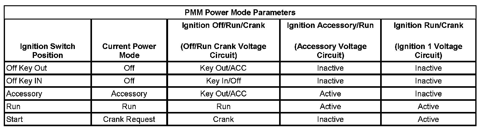 * The power modes and controls are determined using BCM logic. Comparing the Body Control Module Power Mode data display parameters listed in Circuit/System Verification will determine if there is a power mode fault.