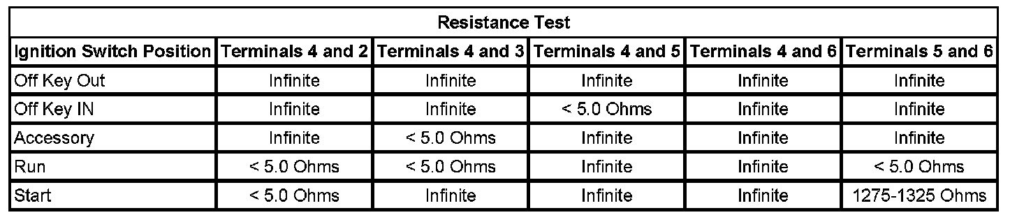 2. Using the Resistance Test table below, check the resistance between the terminals of the ignition switch listed in each switch position.