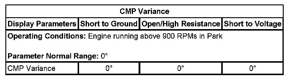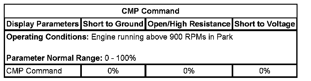 The ECM detects that the state of the high side driver and the state of the CMP solenoid control circuit does not match. The ECM will detect an open, high resistance, short to ground, or a short to voltage on the CMP solenoid control circuit, or an open on the low reference circuit, if the condition is present for more than 6 seconds.