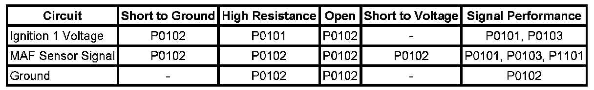 * A steady or intermittent high resistance of 15 ohms or greater on the ignition 1 voltage circuit will cause the MAF sensor signal to be increased by as much as 60 g/s.