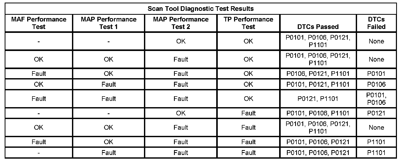 The estimates of MAF and MAP obtained from this system of models and calculations are then compared to the actual measured values from the MAF, MAP, and the TP sensors and to each other to determine the appropriate DTC to fail. The following table illustrates the possible failure combinations and the resulting DTC or DTCs.