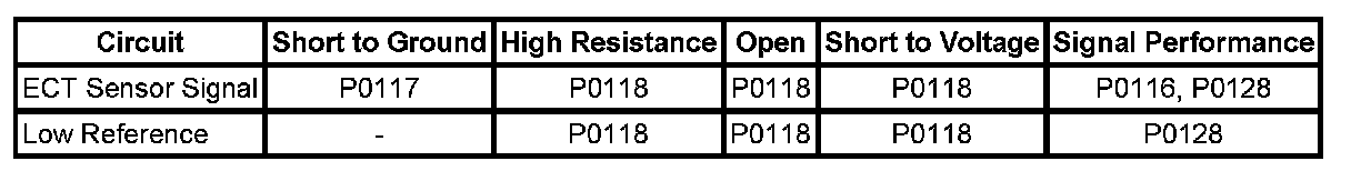 The engine coolant temperature (ECT) sensor is a variable resistor that measures the temperature of the engine coolant. The engine control module (ECM) supplies 5 volts to the ECT sensor signal circuit, and supplies a ground to the low reference circuit. The ECM uses this high side coolant rationality diagnostic to determine if the input from the ECT sensor is skewed warmer than normal. The internal clock of the ECM will record the amount of time the ignition is OFF. If the calibrated ignition OFF timer is met at start-up, the ECM will compare the temperature difference between the ECT and the intake air temperature (IAT), to determine if the temperatures are within an acceptable operating range of each other.