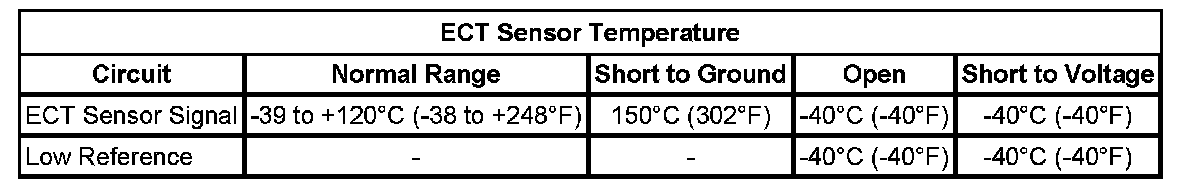Measure and record the resistance of the ECT sensor at various ambient temperatures, then compare those measurements to the Temperature vs Resistance table. Refer to Temperature Versus Resistance.