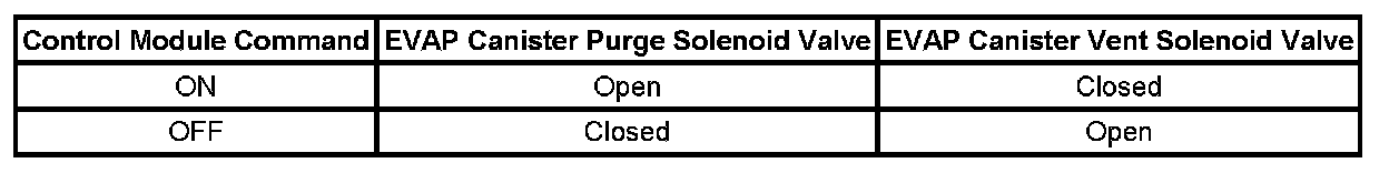 The following table illustrates the relationship between the ON and OFF states, and the Open or Closed states of the EVAP canister purge and vent solenoid valves.