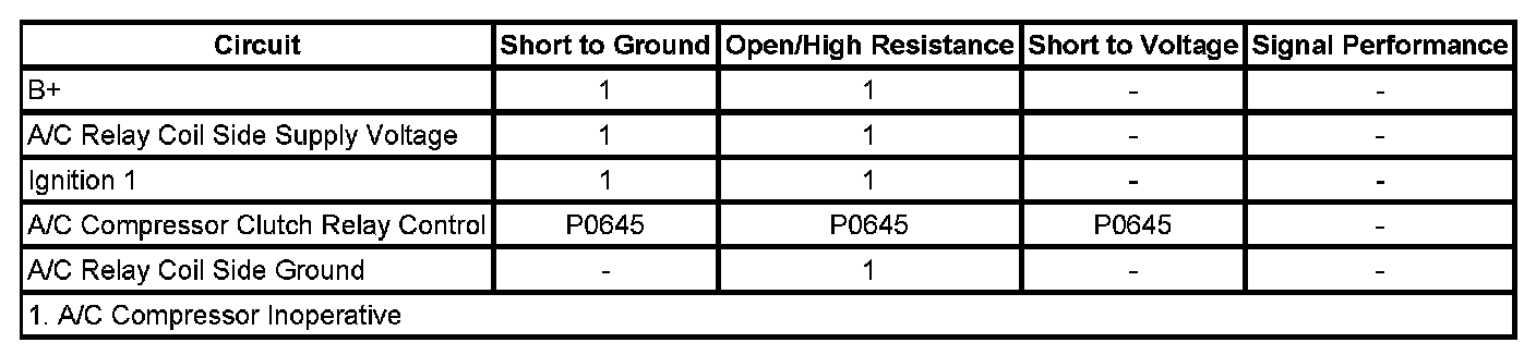 The ECM detects an open on the control circuit of the A/C compressor clutch relay when commanded OFF with the engine in crank or run status.