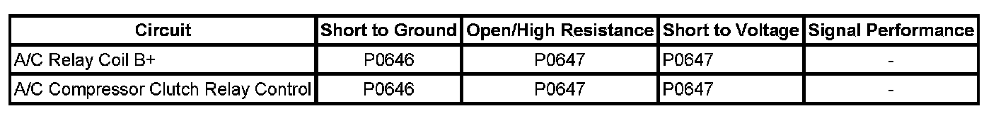A short to voltage, short to ground, or open/high resistance is seen on the A/C compressor clutch relay control circuit.