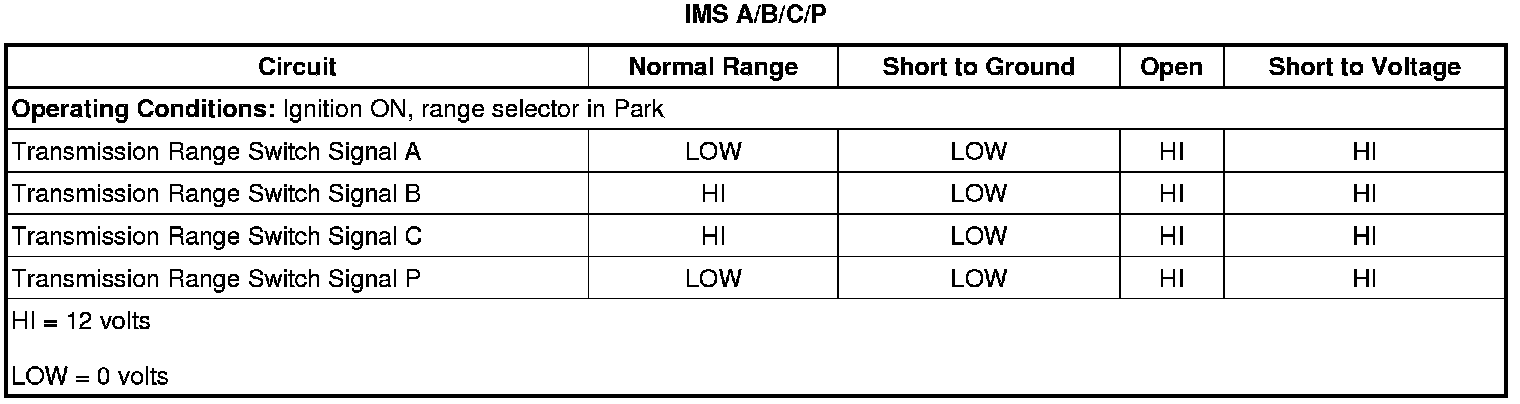 The internal mode switch (IMS) assembly is a sliding contact switch that connects to the control solenoid (w/body and TCM) valve assembly within the transmission. The 4 inputs to the transmission control module (TCM) from the switch indicate which position is selected by the transmission manual shaft. The input voltage at the TCM is high when the switch is open and low when the switch is closed to ground. The state of each input is displayed on the scan tool as IMS. The IMS input parameters represented are transmission range signal A, Signal B, signal C, and signal P.