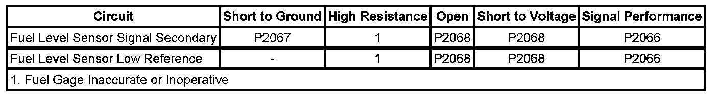 The primary fuel level sender and the secondary fuel level sender changes resistance based on fuel level. The engine control module (ECM) monitors the signal circuits of the primary fuel level sender and the secondary fuel level sender in order to determine the fuel level. When the fuel tank is full, the resistances of both fuel level senders are low and the ECM senses a low signal voltage on both the signal circuits of the primary fuel level sender and the secondary fuel level sender. When the fuel tanks are empty, the resistances of the fuel level senders are high and the ECM senses a high signal voltage. The ECM uses the signal circuits of the primary fuel level sender and the secondary fuel level sender in order to calculate the percentage of remaining fuel in the tank. The ECM sends the fuel level percentage via GMLAN serial data circuit to the instrument cluster in order to control the fuel gage. The fuel information is also used for misfire, evaporative emission (EVAP), and other onboard diagnostics.