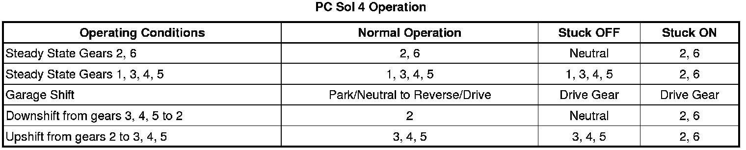 The clutch pressure control (PC) solenoid 4 is integral to the control solenoid (w/body and TCM) valve assembly and has no serviceable parts. The PC solenoid 4 is a normally high-pressure control solenoid which provides fluid pressure to the B-2-6 clutch regulator valve. The TCM controls the solenoid pressure by regulating the exhaust fluid. When the TCM commands the solenoid off, the exhausting fluid is stopped and the B-2-6 pressure is high. When commanded on, the clutch PC solenoid 4 regulates the amount of exhausting transmission fluid. Solenoid power is supplied by the TCM through a high side driver (HSD). The HSD protects the circuits and components that the TCM powers. Should the circuit overload the driver will shutdown. After the overload is removed the HSD reset.