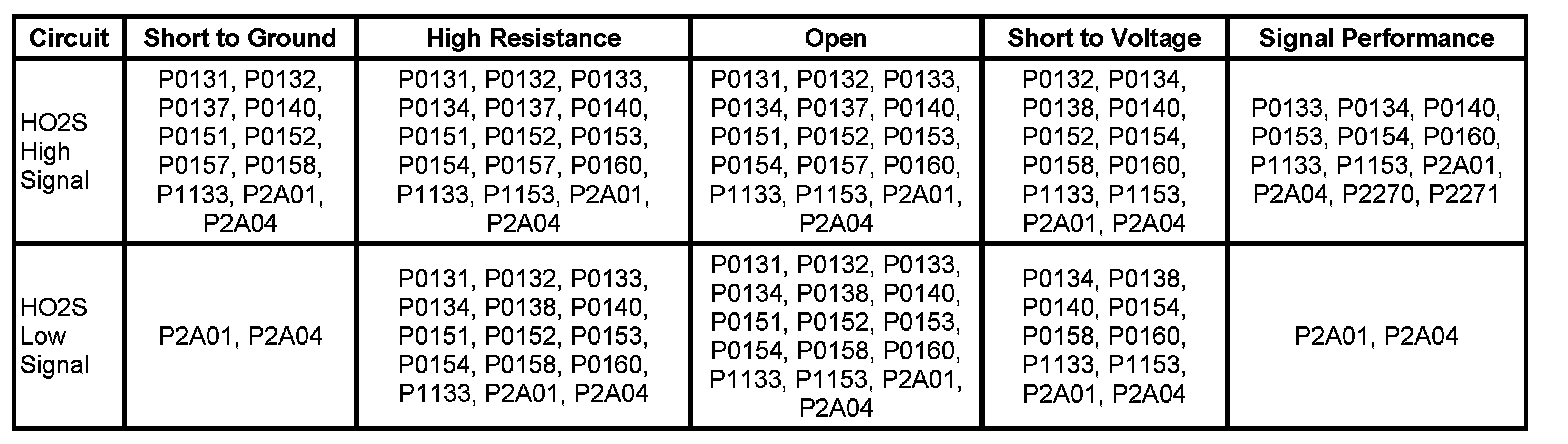 DTC P0133, P0134, P0140, P1133, P2270, P2271, P2A00, or P2A01